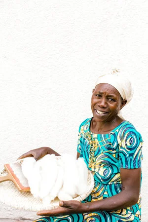 Marguerite was born in 1962 and has two biological children. Before coming to work for Handspun Hope her life was very difficult. Her husband died in 1994 from an unknown illness while they were refugees in Congo. They had no home and were very poor. As a poverty-stricken widow, Marguerite faced harassment from her family because of her inability to care for her children. Before coming to Handspun Hope, she survived by working for others hauling sacks of potatoes or hoeing fields. She joined Handspun Hope in July 2012 and was then able to buy a goat, food and clothes. She joined the savings cooperative and was able to save enough to have electricity installed in her home.